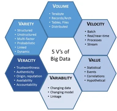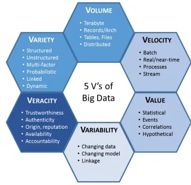 Çeşitlilik (Variety): Üretilen verilerin büyük bir kısmı, birbirinden farklı formata sahiptir. Telefonlardan, tabletlerden, bilgisayarlardan; farklı işletim sistemlerinden ya da dillerden gelen veriler birbirinden farklı formatların ortaya çıkmasına neden olmaktadır.