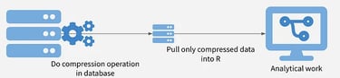 Bu stratejide, verileri veritabanında sıkıştırırız ve yalnızca sıkıştırılmış veri kümesi veritabanından R‘a taşınır. Verileri R‘a çekmeden önce veritabanında özetleme veya filtreleme yaparak hızlandırmalar elde etmemiz genellikle mümkündür.