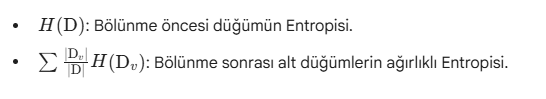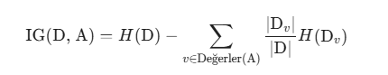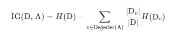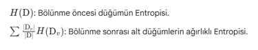 Amaç: Bir düğüm bölündükten sonra, alt düğümlerin $I_G$ değerlerinin ağırlıklı ortalamasını minimize etmektir. $I_G$ sıfıra (0) ne kadar yakınsa, düğüm o kadar saftır (homojendir).