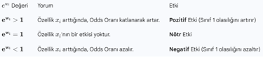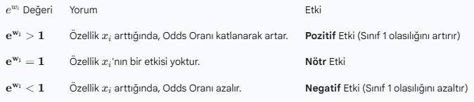 Bir özelliğin katsayısı ($w_i$) ne kadar büyük ve pozitifse, o özellik pozitif sınıfın (1) olasılığını o kadar artırır. Bu ilişkiyi anlamak için $w_i$'nin üstelini (e^wi) alırız.