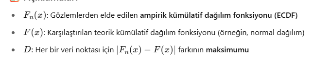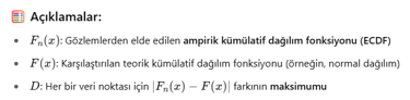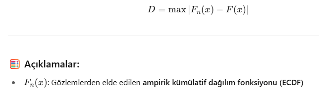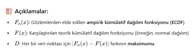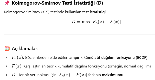 Kolmogorov-Smirnov (K-S) Testi bir veri setinin belirli bir dağılıma (genellikle normal dağılım) uyup uymadığını test eden bir normallik testidir. Ayrıca iki farklı dağılımı karşılaştırmak için de kullanılabilir. Veri dağılımı ile referans dağılım arasındaki en büyük farkı ölçer. Parametrik olmayan bir testtir (dağılım varsayımı gerekmez). Hem tek örneklem hem iki örneklem versiyonu vardır: Tek örneklem: Veri seti, belirli bir teorik dağılıma uyuyor mu? (örneğin normal dağılım) İki örneklem: İki veri seti aynı dağılımdan mı geliyor? D test istatistiği ile karşılaştırılır.