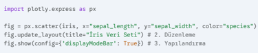 Düzenleme Fonksiyonları (fig.update_layout()): Paylaştığınız görseldeki layout() fonksiyonuna eşdeğerdir; başlık ve eksen ayarları burada yapılır.