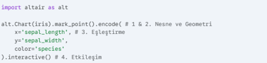 Eşleştirme (encode()): Veri sütunları görsel kanallara (x, y, renk) bağlanır.