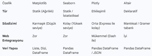 Altair: "Grammar of Graphics" (Grafik Grameri) prensibine dayanır. Kod yazmaktan ziyade verinin neyi temsil ettiğini tanımlamaya odaklanır. Çok temiz ve deklaratif bir yapısı vardır.
